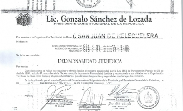 Reconocimiento de personería jurídica San Juan de Kelequelera, como OTB perteneciente al municipio de Guanay