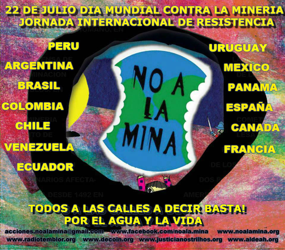 Distintas organizaciones en el mundo han convocado a manifestarse este 22 de Julio en el marco del Día Mundial contra la Megaminería, en una jornada internacional de defensa del agua, la tierra y la vida. La idea es instalar plantones frente a las residencias gubernamentales o palacios legislativos para declarar la opción por una sociedad, una economía y una política libre de megaminería.