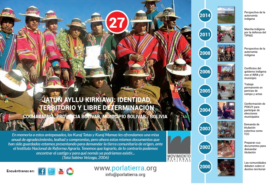 En memoria a estos antepasados, los Kuraj Tatas y Kuraj Mamas les ofrendamos una misa anual de agradecimiento, lealtad y compromiso, pero ahora estos mismos documentos que han sido guardados estamos presentando para demandar la tierra comunitaria de origen, ante el Instituto Nacional de Reforma Agraria. Tenemos que lograrlo, de lo contrario podemos encontrar el castigo y para qué nomás ya podríamos existir...(Tata Sabino Veizaga, 2006)
